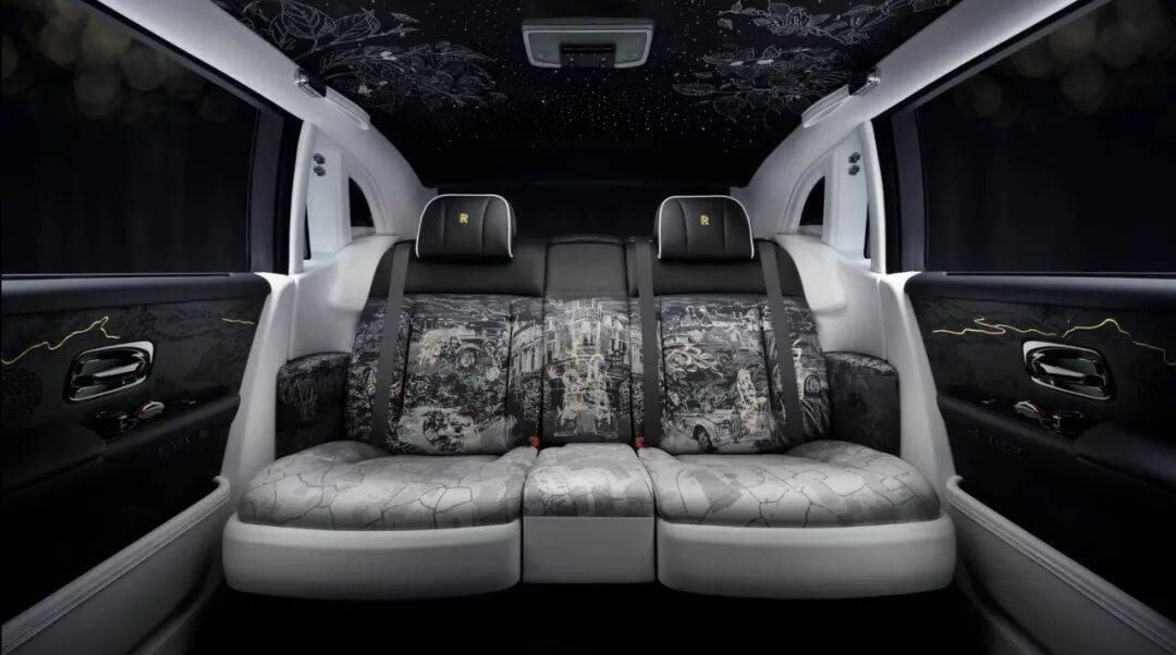 而且这是何等考究的内饰啊!后排座椅采用手工编织的织锦,图案交织重叠着幻影历史上具有重要意义的地点与时刻。从公司位于伦敦康迪特街的原址,到亨利·莱斯描绘法国南部的油画,再到历代幻影的素描草图以及著名幻影车主的刺绣图案,构成了一幅丰富的历史回望画卷。在上面放个屁似乎都成了罪过。