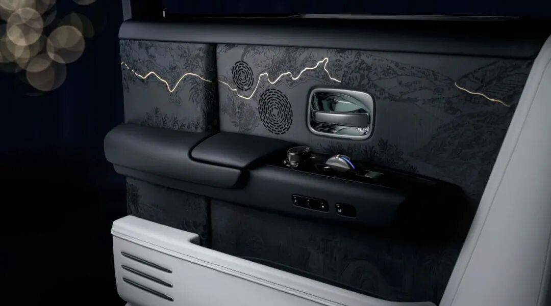 车门,这里承载着劳斯莱斯所称的其有史以来制作过的最复杂的木艺作品。这套染色黑木饰板运用了3D镶嵌细工、激光蚀刻和3D墨水分层技术外加大量金箔,厚度仅为0.1微米。