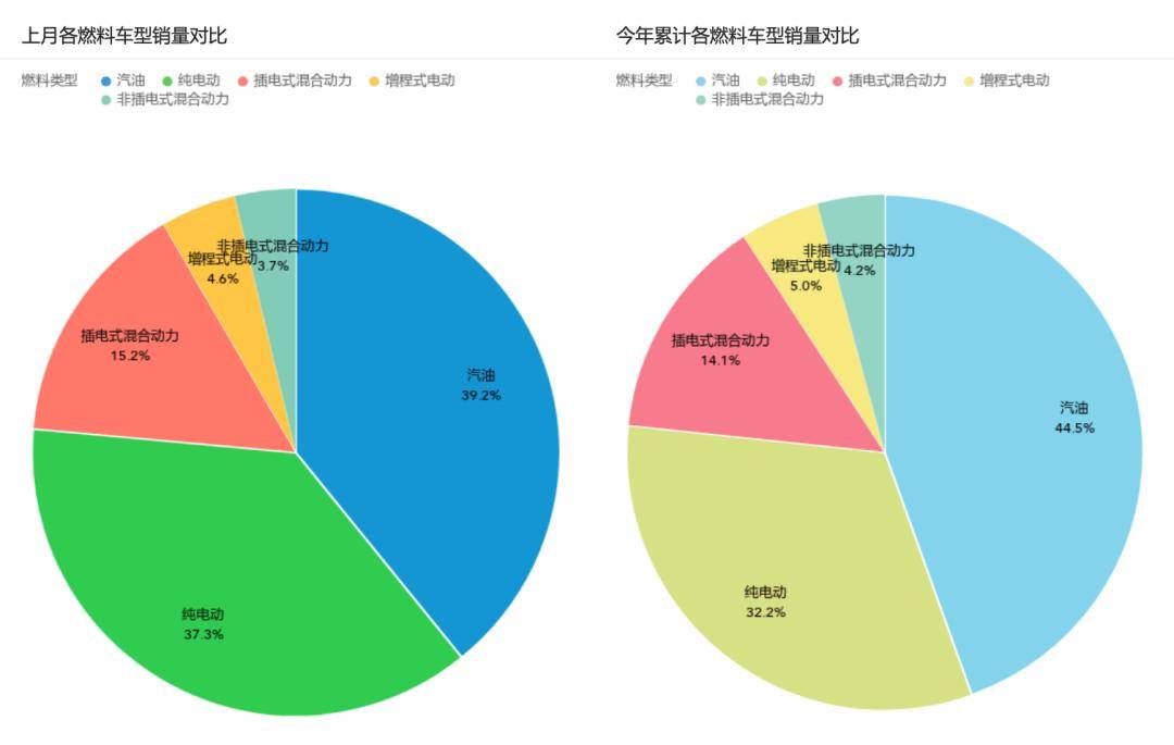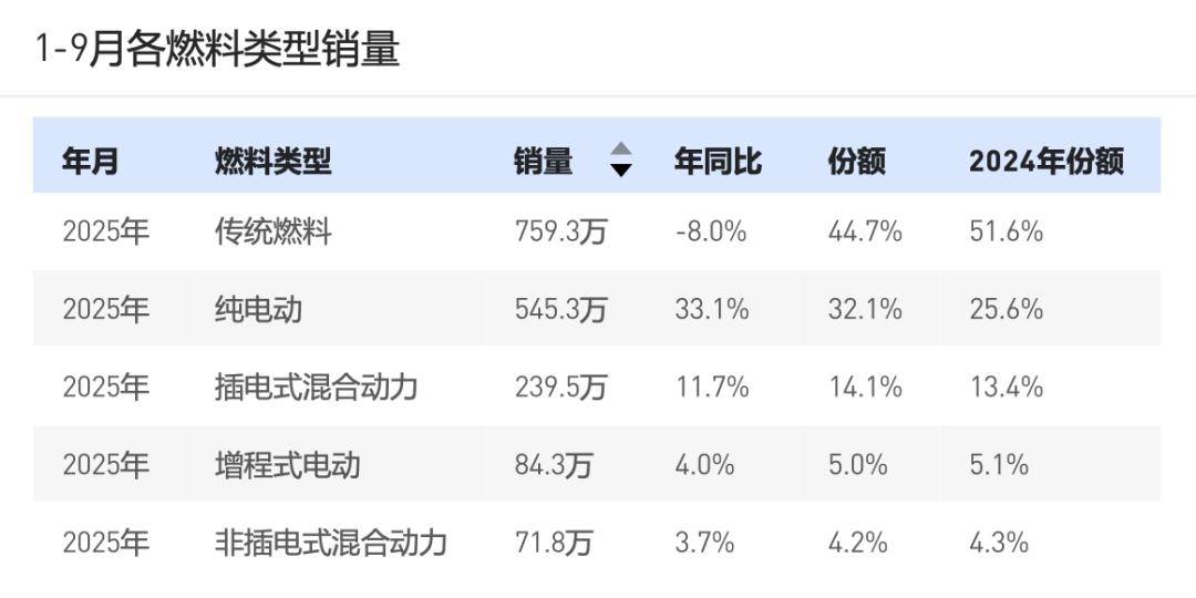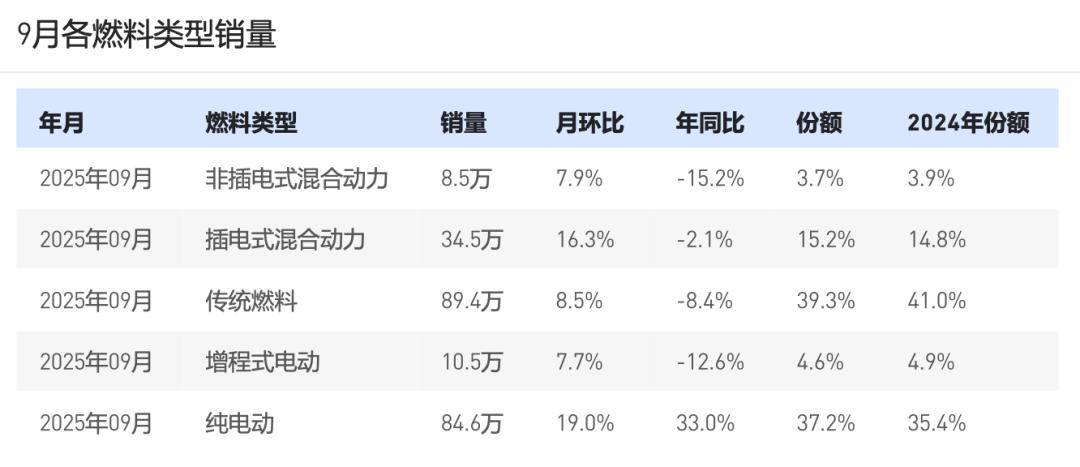1-9月,乘用车累计销售1700万辆,同比增长6.3%,其中新能源车累计销售销售869万辆,同比增长23.2%,占乘用市场份额的51.2%;燃油车(含非插电)销售826.7万辆,同比下滑7.1%,占市场份额为48.8%,与去年同期比较下跌6.9个点。