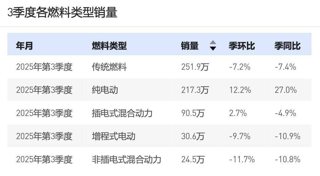第三季度,乘用车市场累计销售614.8万辆,同比增长2.5%,其中新能源车销售338.4万辆,同比增长12.6%;新能源车的增长主要来自纯电车型的增长,3季度纯电车型销售217.3万辆增长27%;同期燃油车(含非插电)、插电混动、增程车型销量分别下滑8%、5%和11%,乘用车市场对于纯电产品的依赖度进一步加深。