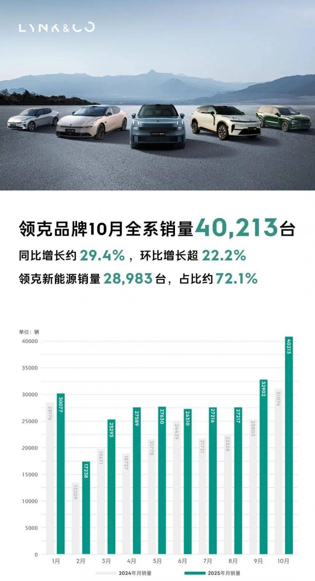11月的第一天,杭州就传来好消息:2025 年 10 月,领克品牌迎来历史性突破:单月销量达40,213 台,同比增长约29.4%,环比增长超22.2%。