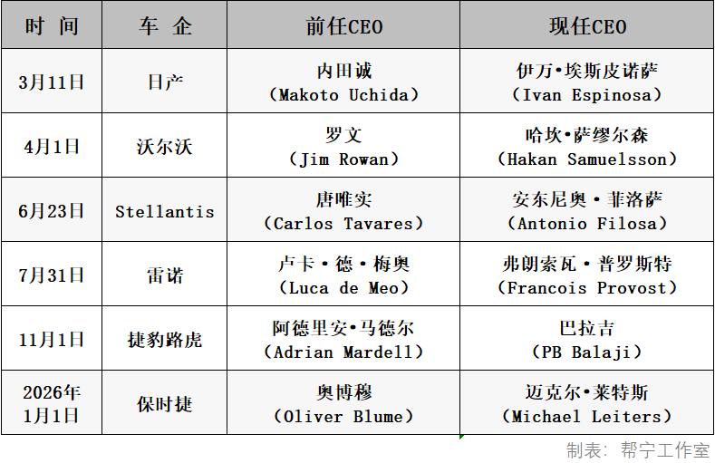 自今年3月以来,保时捷、日产汽车、Stellantis集团、捷豹路虎、雷诺集团和沃尔沃汽车先后任命了新CEO。