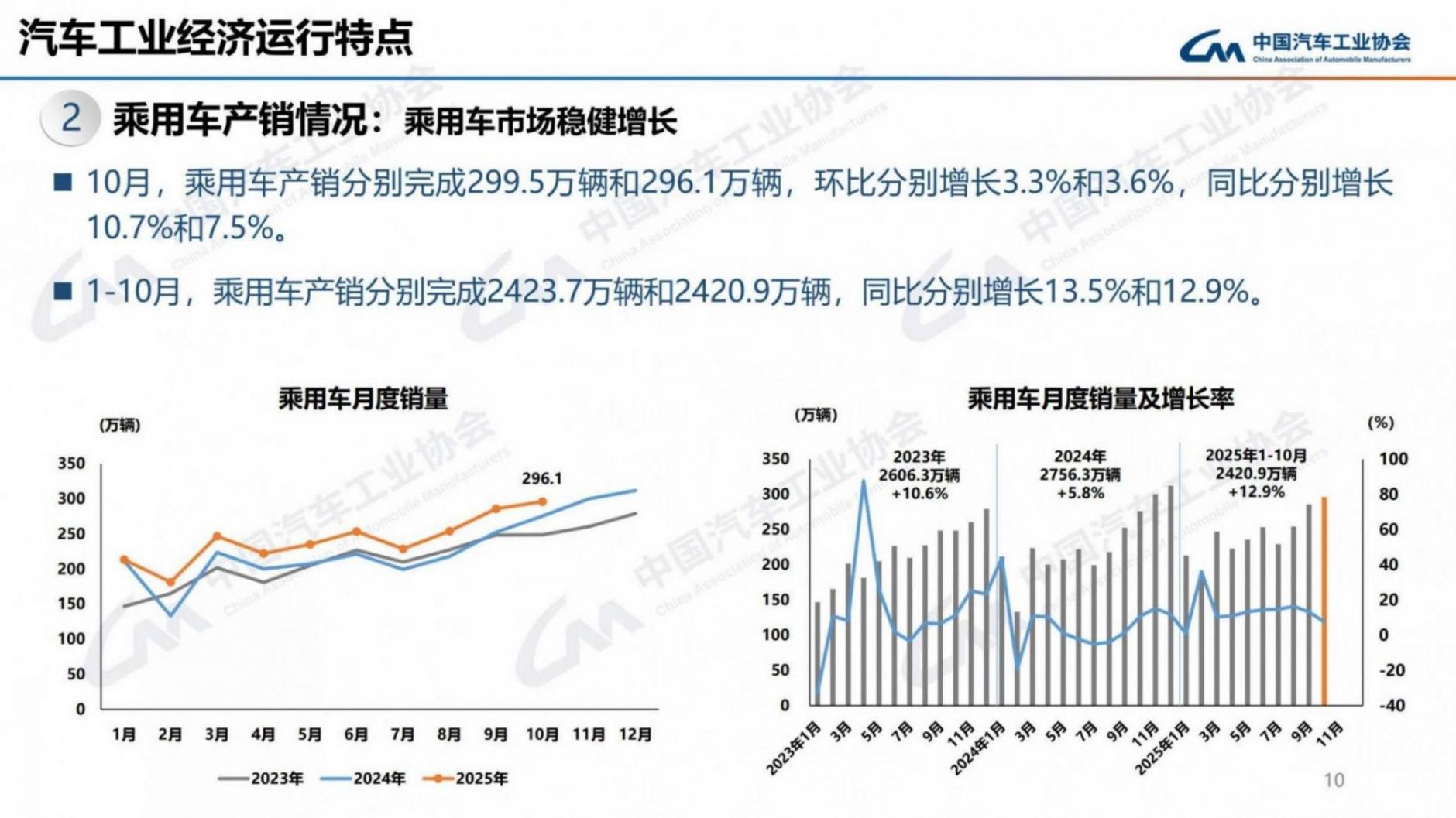 10月,汽车产销分别完成335.9万辆和332.2万辆,环比分别增长2.5%和3%,同比分别增长12.1%和8.8%。1-10月,汽车产销累计完成2769.2万辆和2768.7万辆,同比分别增长13.2%和12.4%。