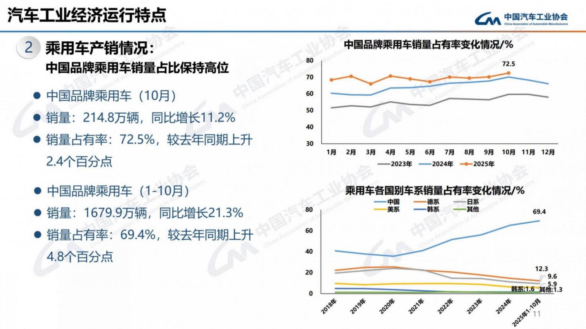 1-10月,中国品牌乘用车共销售1679.9万辆,同比增长21.3%,占乘用车销售总量的69.4%,销量占有率比去年同期提升4.8个百分点。在主要外国品牌中,与去年同期相比,美系品牌和韩系品牌销量小幅增长,其他三大主要品牌销量呈不同程度下降。