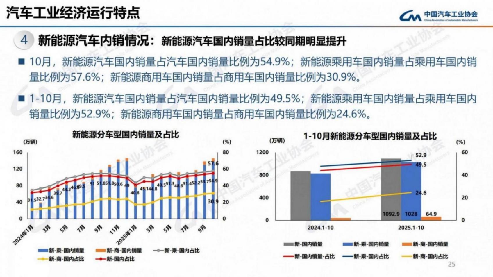 1-10月,新能源汽车国内销量占汽车国内销量比例为49.5%;新能源乘用车国内销量占乘用车国内销量比例为52.9%;新能源商用车国内销量占商用车国内销量比例为24.6%。