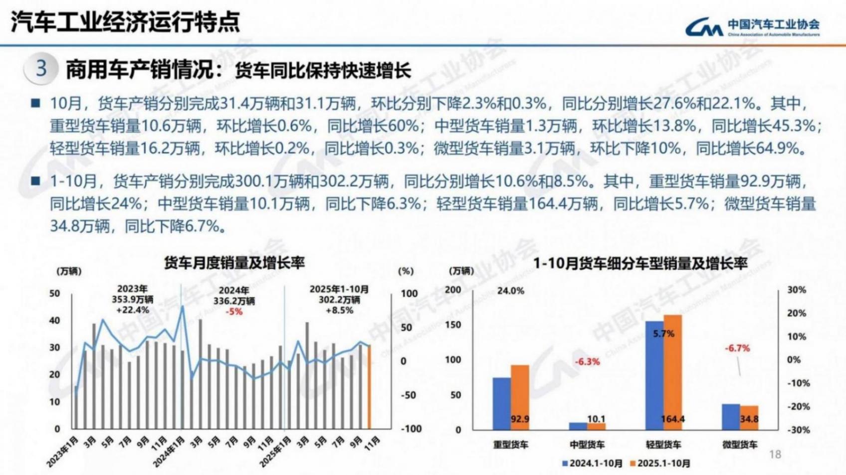 1-10月,商用车产销累计完成345.6万辆和347.9万辆,同比分别增长10.9%和9%。在商用车主要品种中,与去年同期相比,客车和货车产销均呈不同程度增长。