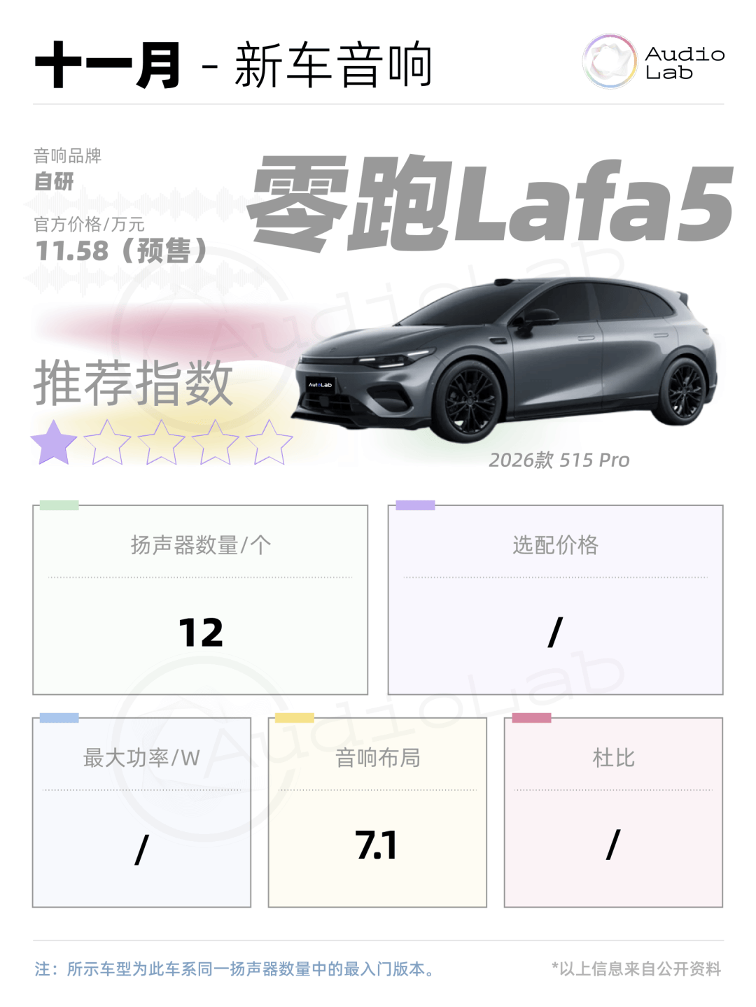零跑Lafa5在音响上的配置可能初看觉得平平无奇,但参考它10万起的亲民价格来看,12个扬声器、7.1声道、以及AI算法这样的配置,其实可以算同级别同价位中比较好的了。