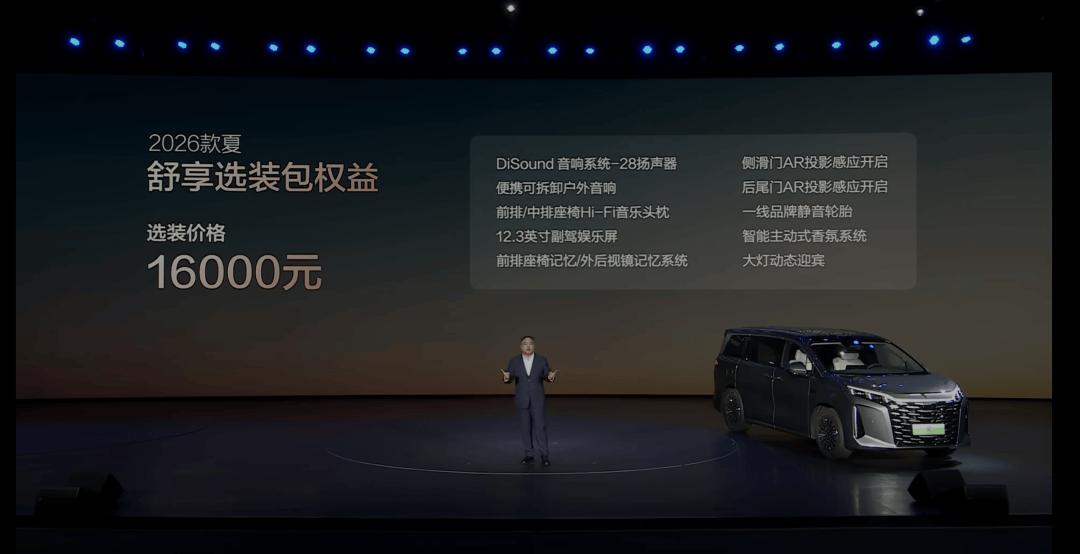 但现在2026款卓越型是在24个扬声器的基础上,需要额外花16000元进行座舱选装包升级,才能获得28扬声器以及可拆卸户外音响配置,也并没有限时免费送。