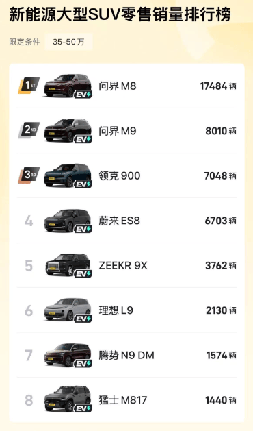 到了下半年的10月份,大型混动SUV的榜单排位再次生变,领克900已经来到了第三名,前两位是问界M8、M9,理想L9变成了第五名,销量仅为2130台。