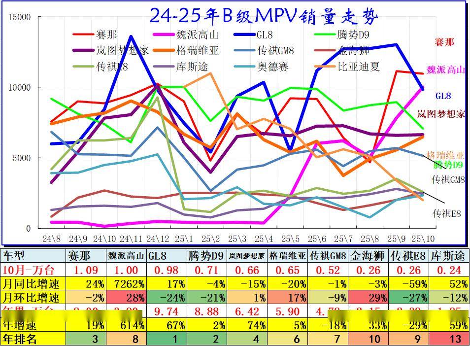 MPV市场的高增长阶段已经改为低增长趋势。GL8近期表现较强,比亚迪与腾势和传祺的MPV表现超强,日系的MPV优势迅速下降。