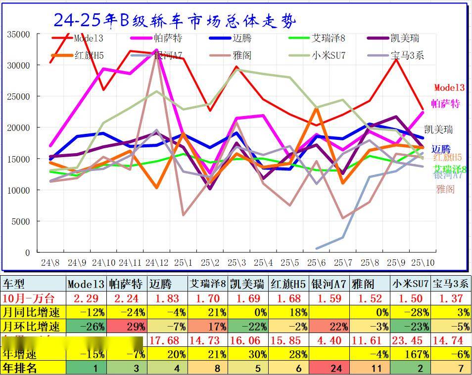 B级轿车2025年10月批发36.88万台,占批发份额31.41%,批发较去年同期同比增长3%,批发环比今年上月增长0%;2025年10月零售较去年同期同比增长4%,零售环比今年上月下降3%。2025年1-10月批发数量327.32万台,厂家批发销售累计增幅6%;2025年1-10月国内零售数量302.97万台,零售累计增幅9%。