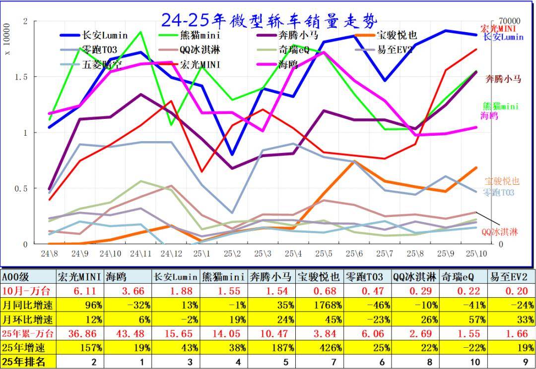 A00级市场重回20年前的竞争格局,当年的夏利、奇瑞、吉利、长安、比亚迪均有A00级较好的产品,近期比亚迪、吉利、长安、奇瑞、一汽奔腾等多元化的A00级主力车型和新品表现突出,微型电动车逐步体现增量潜力。