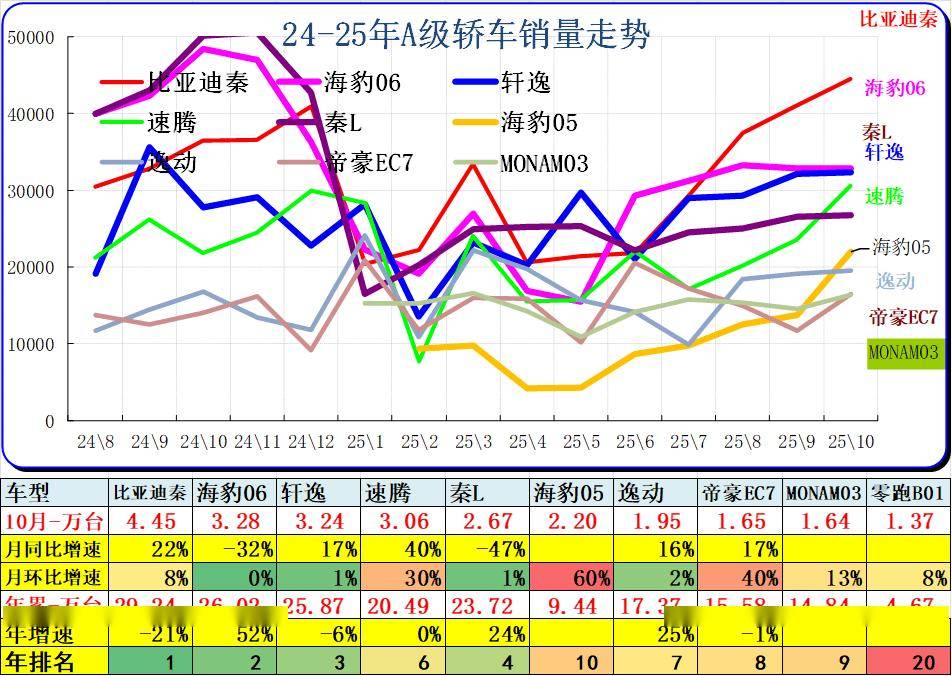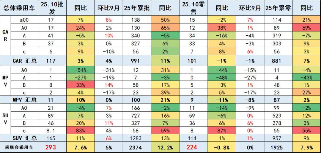 A0级轿车2025年10月批发16.51万台,占批发份额14.06%,批发较去年同期同比增长24%,批发环比今年上月增长2%;2025年10月零售较去年同期同比增长38%,零售环比今年上月增长1%。2025年1-10月批发数量129.96万台,厂家批发销售累计增幅65%;2025年1-10月国内零售数量89.08万台,零售累计增幅69%。