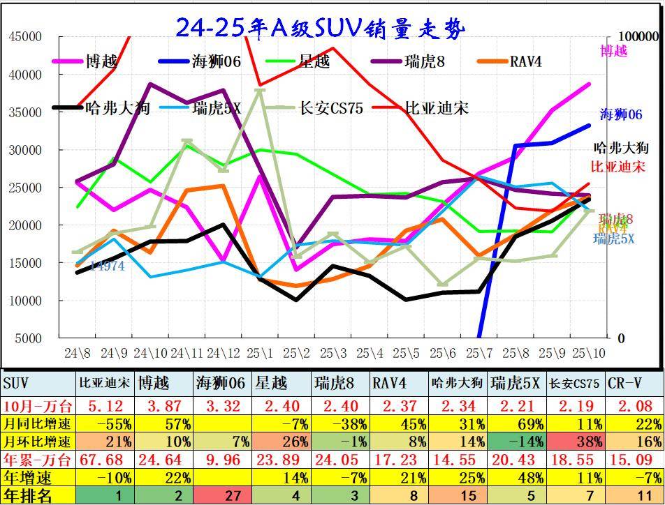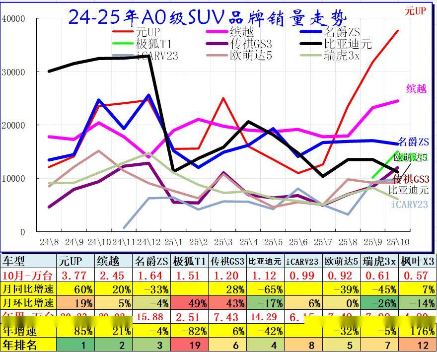 A0级SUV 2025年10月批发20.79万台,占批发份额12.63%,批发较去年同期同比下降4%,批发环比今年上月增长7%;2025年10月零售较去年同期同比下降14%,零售环比今年上月下降9%。2025年1-10月批发数量166.03万台,厂家批发销售累计下降2%;2025年1-10月国内零售数量98.7万台,零售累计下降2%。