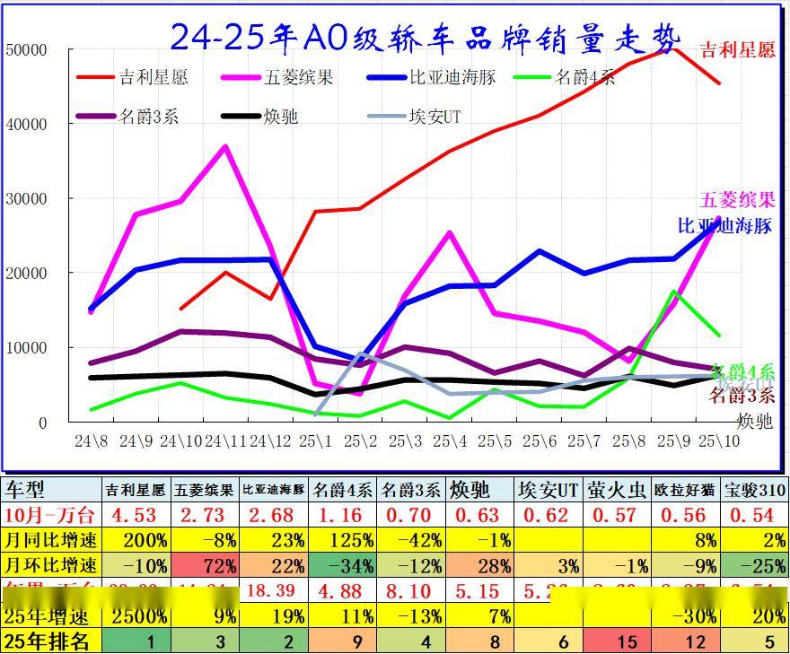 A0级轿车的全面电动化趋势明显,基本没有太强的燃油车产品,体现了自主的纯电动的产品优势明显。