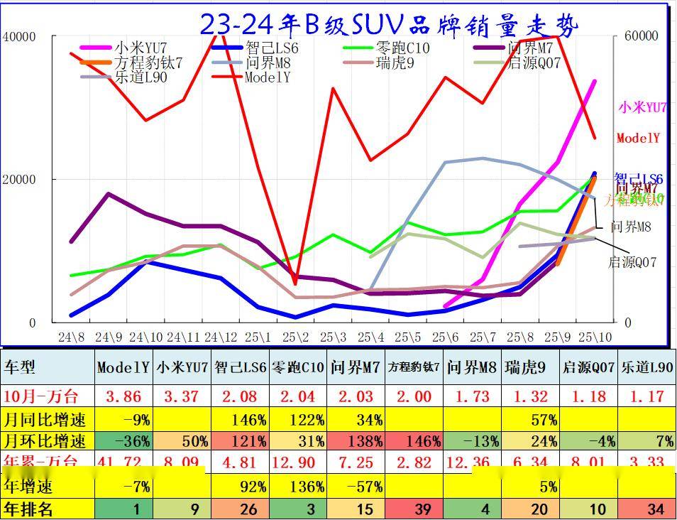 B级SUV 2025年10月批发45.99万台,占批发份额27.94%,批发较去年同期同比增长20%,批发环比今年上月增长11%;2025年10月零售较去年同期同比增长6%,零售环比今年上月增长6%。2025年1-10月批发数量326.6万台,厂家批发销售累计增幅7%;2025年1-10月国内零售数量277.63万台,零售累计增幅3%。