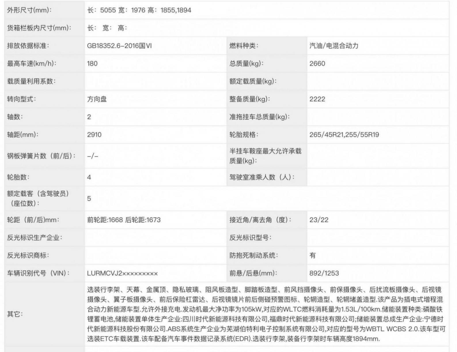 动力总成是1.5T增程,1.5T发动机输出115kW。估计会标配双电机,因为申报目录上没有详细信息,只是考虑到34.3度电的磷酸铁锂电池的WLTC工况纯电续航只有145-150公里,预计双电机概率更大。同时百公里油耗为7L左右,算是一个比较高的油耗。
