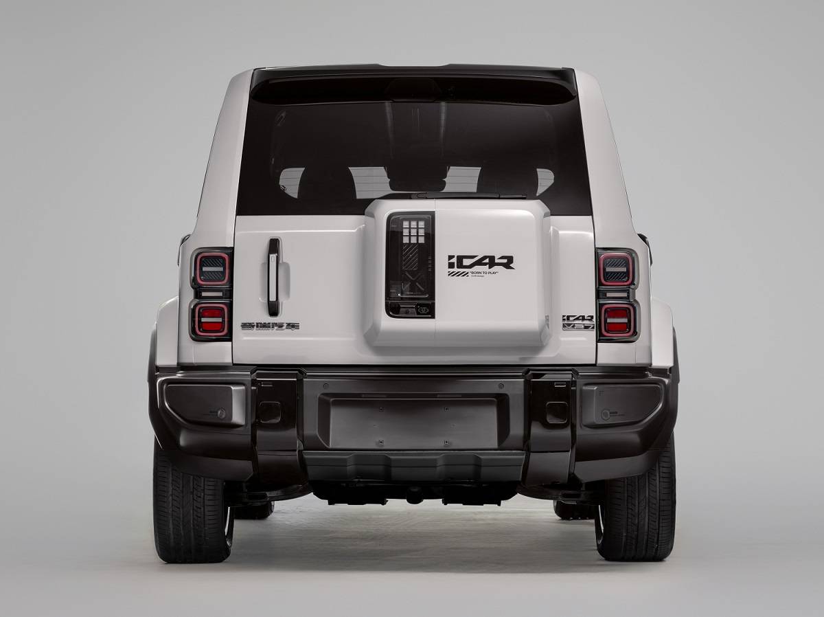 尾部也是越野车传统的硬朗方正风格,竖状尾灯为双圆角矩形组合,有外露备胎和方形储物盒的选择。后保险杠则是越野车常见的大离去角设计,H元素的后杠看上去也更结实。