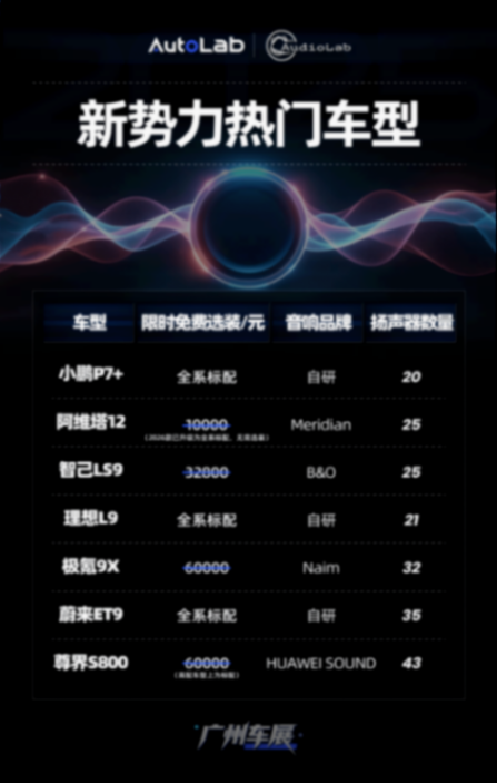 与传统豪华品牌形成鲜明对比的,是新势的“内卷式配置”。不是直接全系标配自研音响,就是限时0元免费送品牌音响。