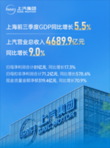 今年上汽集团第三季度财报显示,上汽前三季度整车批售量319.3万辆,同比增长20.5%;营收4689.9亿元,同比增长9%;归母净利润81亿元,同比增长17.3%。其中,三季度整车批售114.1万辆,同比增长38.7%;营收1694亿元,同比增长16.2%;归母净利润20.8亿元,同比增长644.9%。