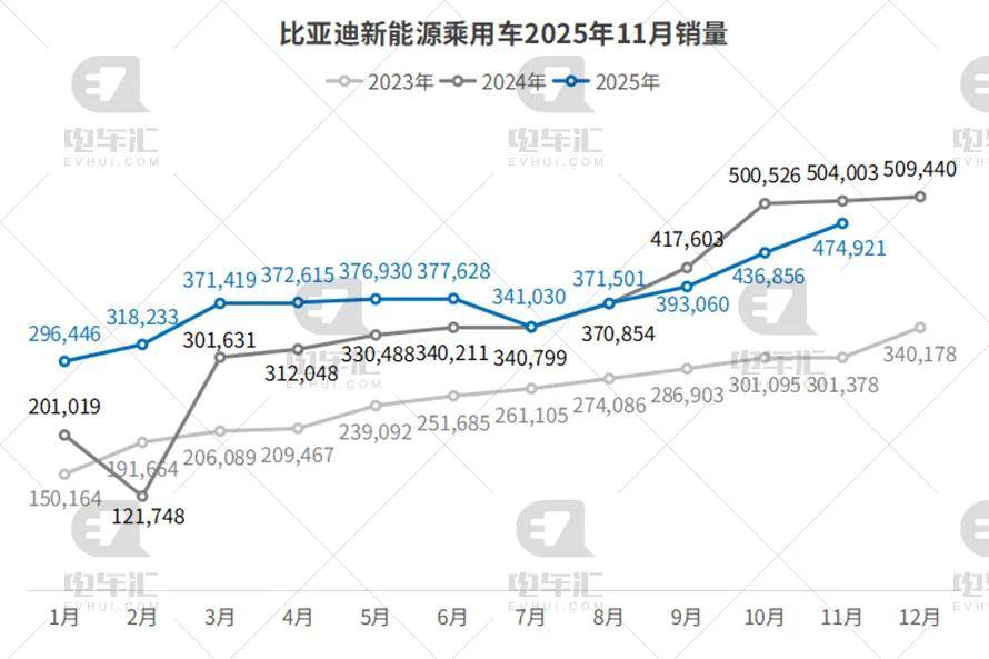 11月销量达474,921辆,环比增长8.7%,受去年同期高基数影响,同比微降5.8%;1–11月累计销量4,130,639辆,同比增长10.4%。王朝+海洋双网持续热销,海豹06DM-i、宋PLUSEV等主力车型订单饱满,DM5.0平台与规模化效应支撑其全年冲击450万辆目标几无悬念。