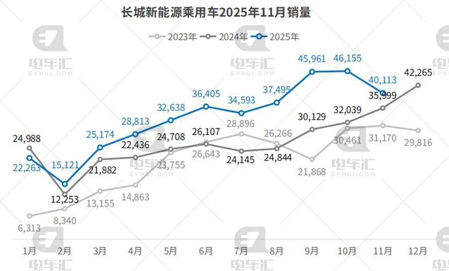长城11月销量40,113辆,环比下滑13.1%,但同比增长11.4%;1–11月累计364,731辆,同比增长30.5%。坦克300PHEV、高山MPV贡献主力增量,Hi4-T越野混动技术构筑差异化优势,短期波动不改长期赛道壁垒。