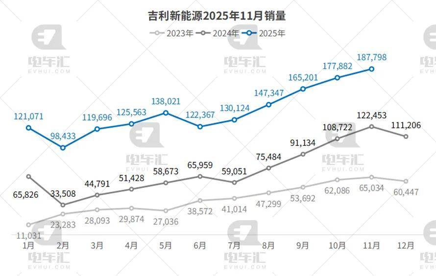 吉利11月交付187,798辆,环比增长5.6%,同比大幅增长53.4%;1–11月累计销量1,533,503辆,同比飙升97.4%。银河E5、星愿纯电车型快速上量,雷神混动在10–15万元主流市场持续挤压燃油车份额,电动化转型成效显著,稳居自主品牌第二梯队领头羊。