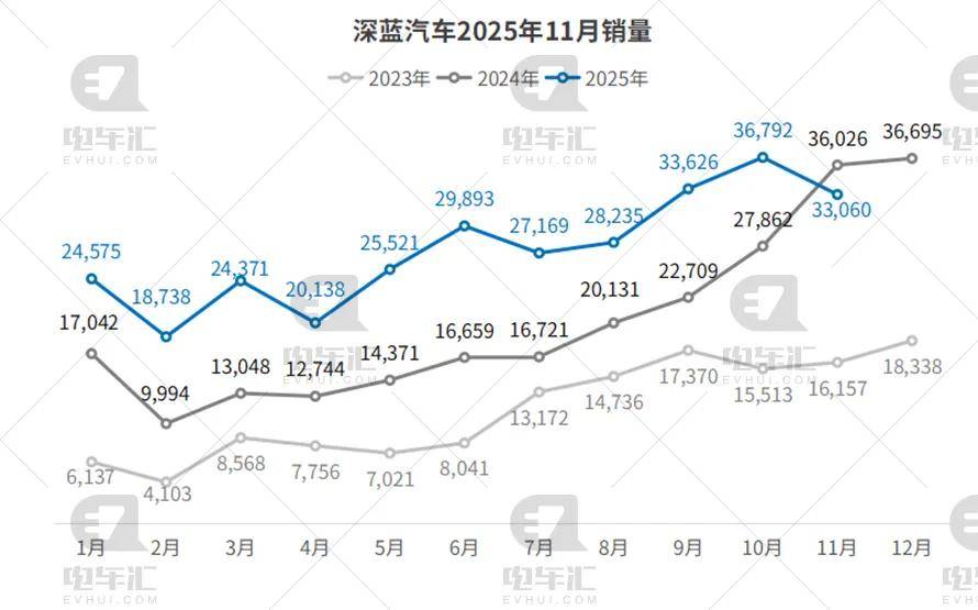 深蓝11月交付33,060辆,环比下降10.1%,同比也减少了8.2%;1–11月累计302,118辆,同比增长45.7%。SL03增程冠军版、G318硬派SUV双线发力,华为ADSSE高阶智驾选装率稳定,品牌高端化路径清晰。