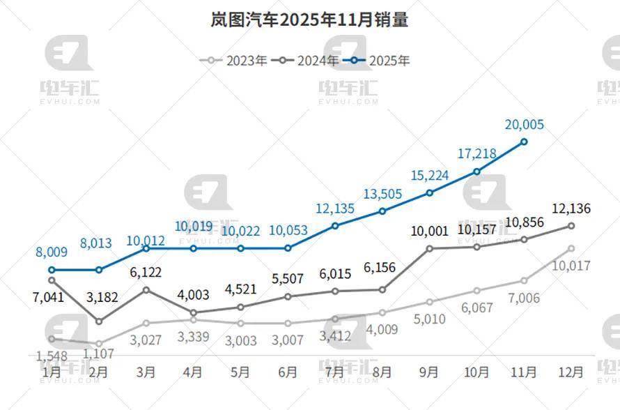 岚图11月交付20,005辆,环比大增16.2%,同比飙升84.3%;1–11月累计134,215辆,同比增长82.5%。追光L、梦想家PHEV搭载鸿蒙座舱后订单激增,北欧首批FREE完成发运,央企高端新能源出海模式初具雏形。