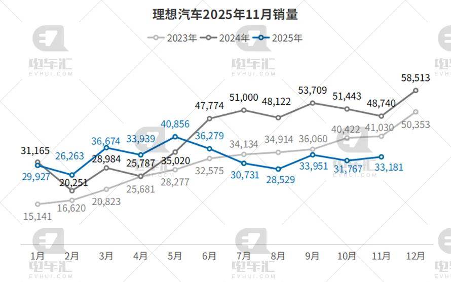 理想11月交付33,181辆,环比增长4.5%,但受高基数拖累,同比下滑31.9%;1–11月累计362,097辆,同比下降18.1%。纯电i6开启规模化交付,L系列改款同步推进,四季度有望重回环比增长通道。