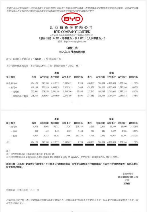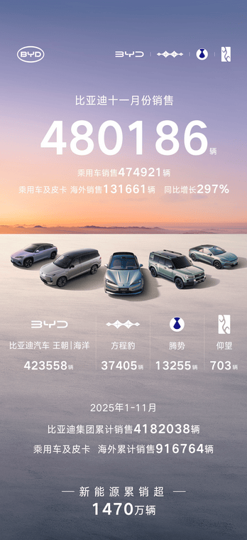 12月1日晚,比亚迪11月销量数据公布,11月销售48.02万辆,创年内新高!2025年1-11月累计销售418.2万辆,新能源累计销售超1470万辆。