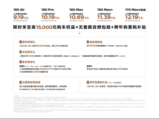 日产N6一共5款车型,其中最低配的180 Air可以排除掉,因为它算是拉低起售价的吉祥物,功能性配置缺得比较多。同时对于想快点提车的人来讲,180 Max+和170 Max+旗舰也可以不用看,因为这两款车型因为8775芯片的排产问题,预计明年2月份才能交付,也就意味着不能享受购置税兜底补贴。
