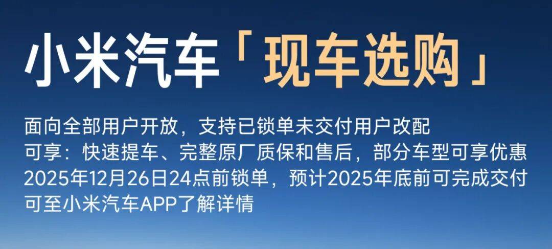 用“从天而降”来描述,当然是一句玩笑话。在小米汽车发布的公告中,已经对“现车”的来源与类型进行了说明。其中,“准新车”是指“曾因运输等原因出现过轻微瑕疵的原厂新车,已完成官方修复及售前附加检验”。对大多数用户而言,这应该算可以理解的情况。