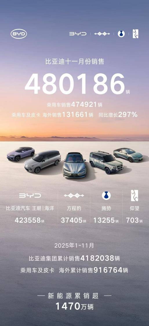 经历过数年至暗时刻,和中国新能源汽车肩并肩迈入发展快车道的比亚迪,在11月再次以一份亮眼的成绩单,展现了其作为新能源领军者的强劲势头,全月销售480186辆,持续突破再创年内新高。