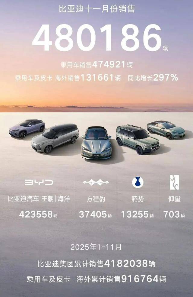 比亚迪11月销售480186辆,创年内新高。海外销售突破13万辆,创历史新高。2025年1-11月累计销售4182038辆,新能源累计销售超1470万辆。