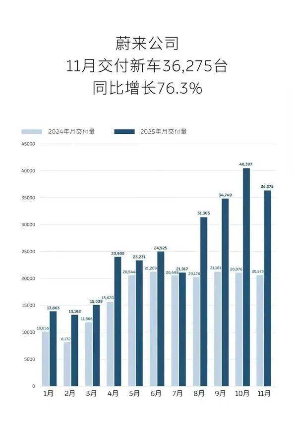 2025年11月,蔚来公司交付新车36275辆,同比增长76.3%。其中,蔚来品牌交付新车18393辆;乐道品牌交付新车11794辆;firefly萤火虫品牌交付新车6088辆。截至目前,蔚来公司已累计交付新车949457辆。