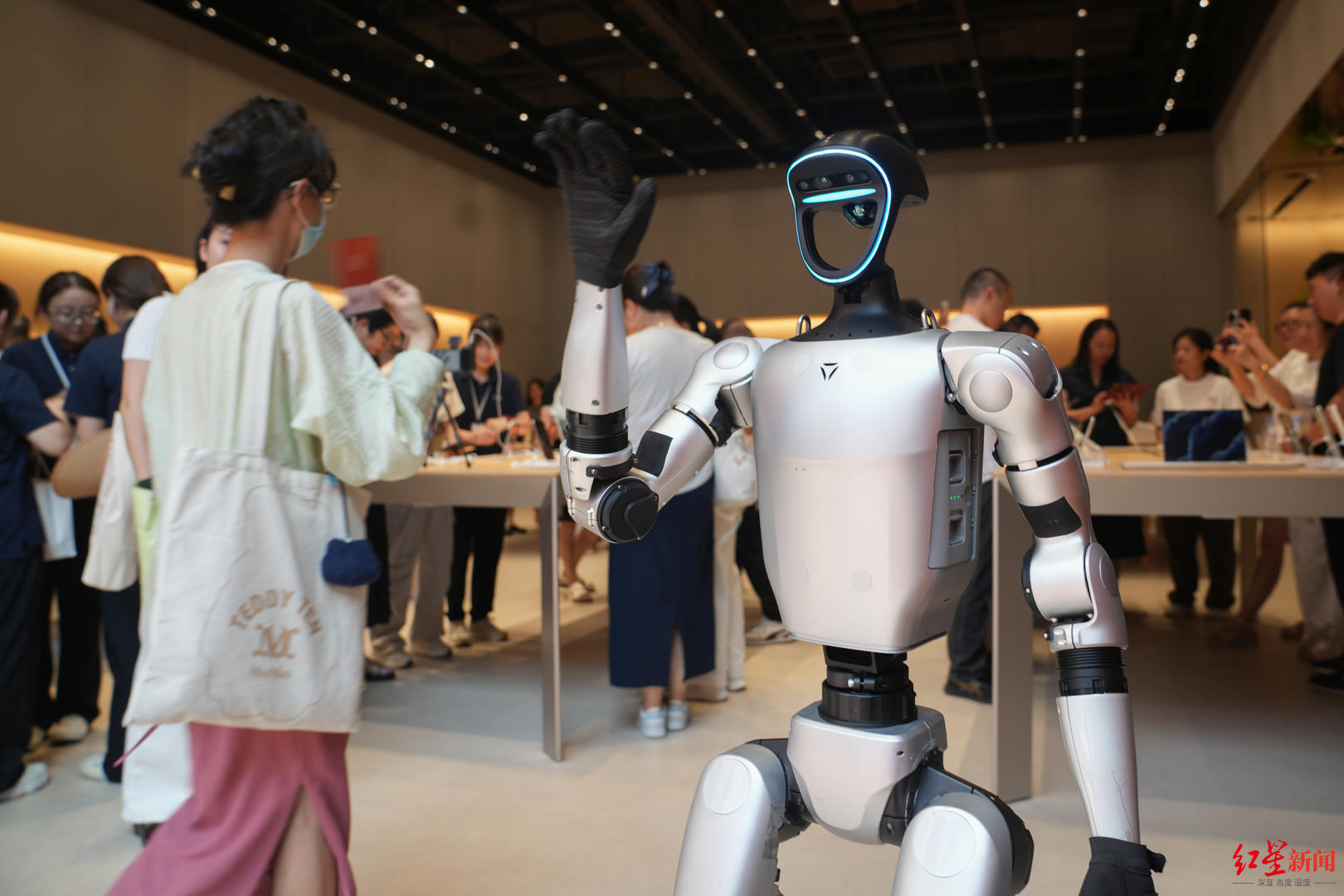 一进门,迎接消费者的除了工作人员外,更有两款宇树G1人形机器人与来宾击掌相庆,送上科技感十足的欢迎。市民苏小姐表示:“虽然已经从网上知道人形机器人,但到面前来击掌还是令人很惊喜。”