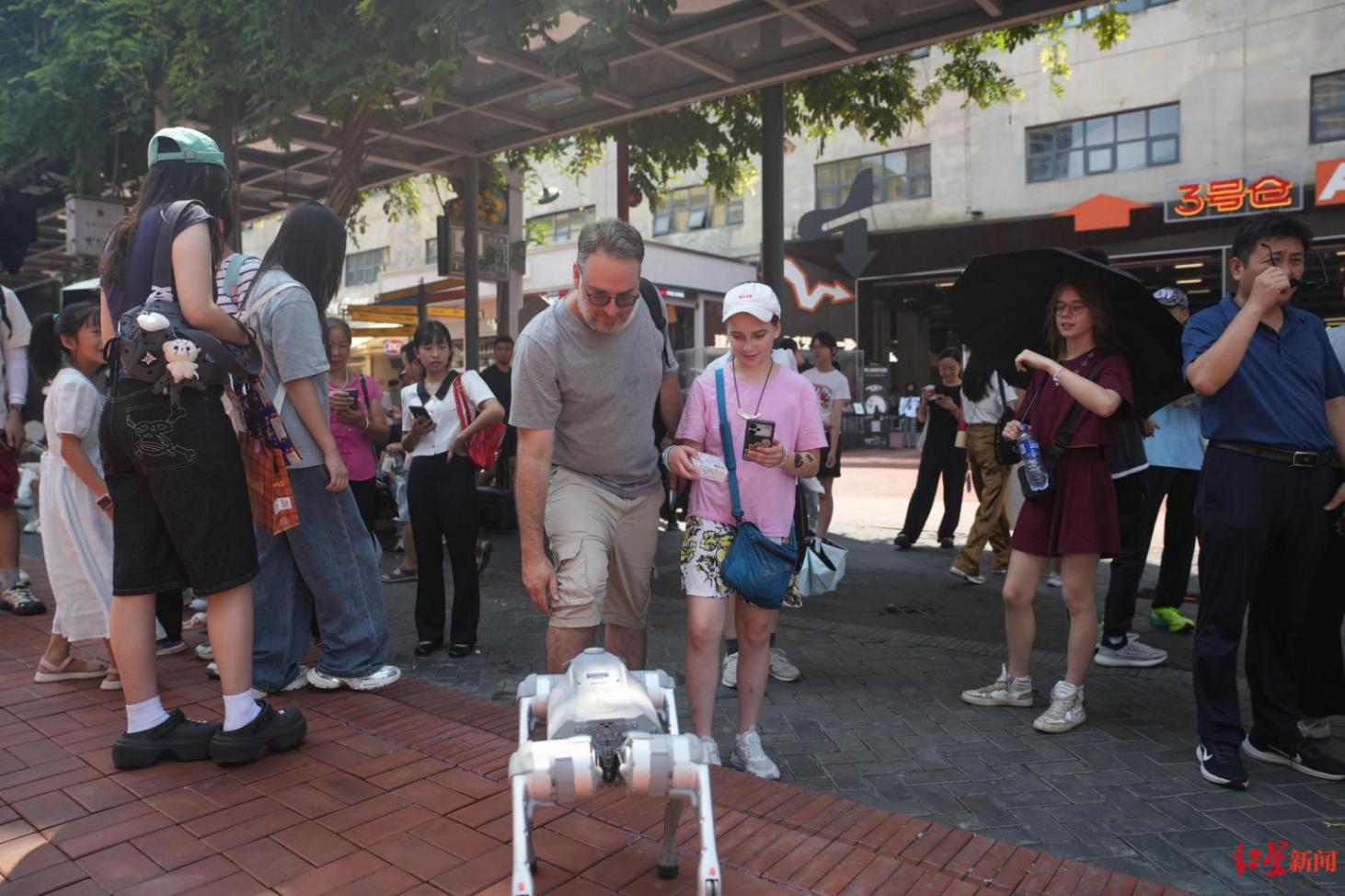 具身机器人在体验店门口与外国游客互动