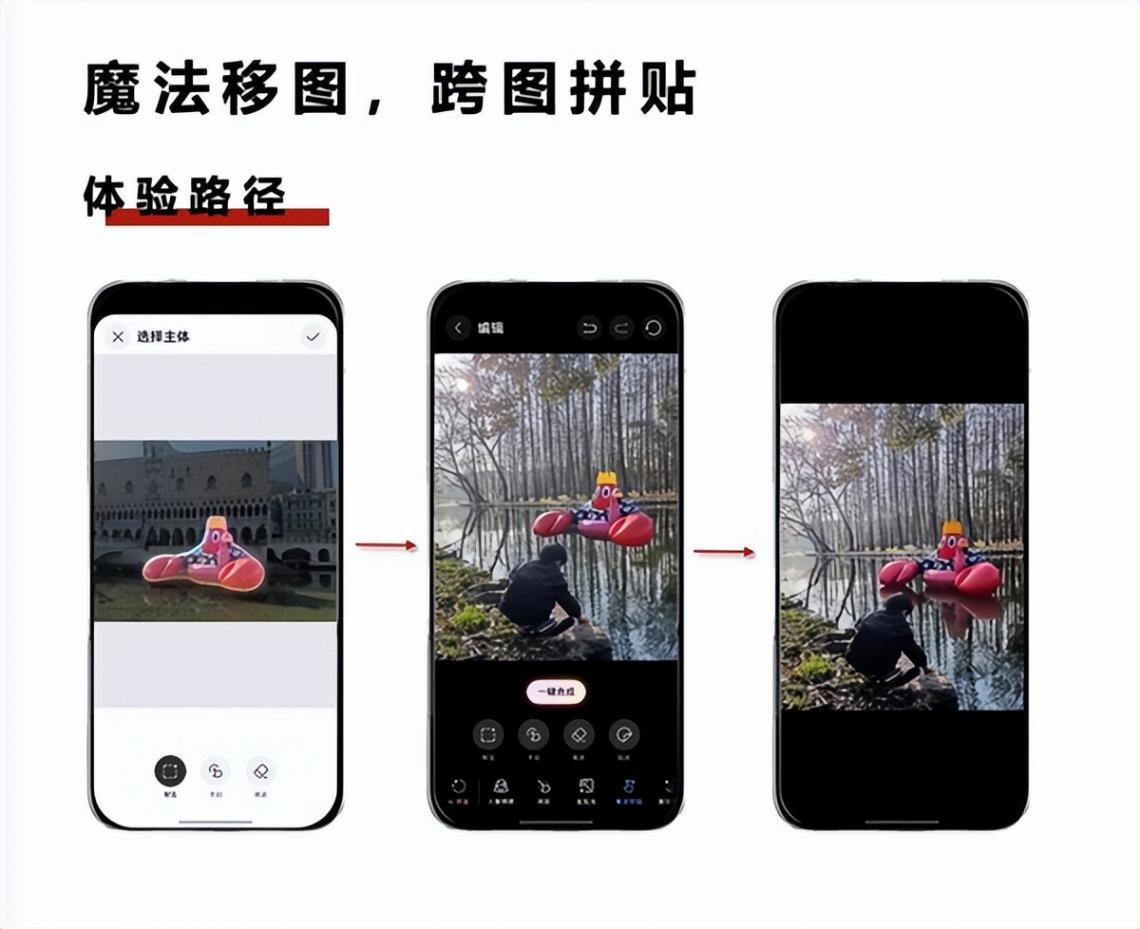 如果想玩点新花样,XMAGE风格个性色卡还有胶片风、动漫风、电影风、自然风可供选择,宿舍楼道的随手拍加个色卡,瞬间出大片。还有魔法移图新功能,华为Pura 80系列的魔法移图功能新升级,支持跨图创意抠贴,可智能抠取其他图片上的元素与原图一键融合,生成一张新的图片,解锁创意更多可能。