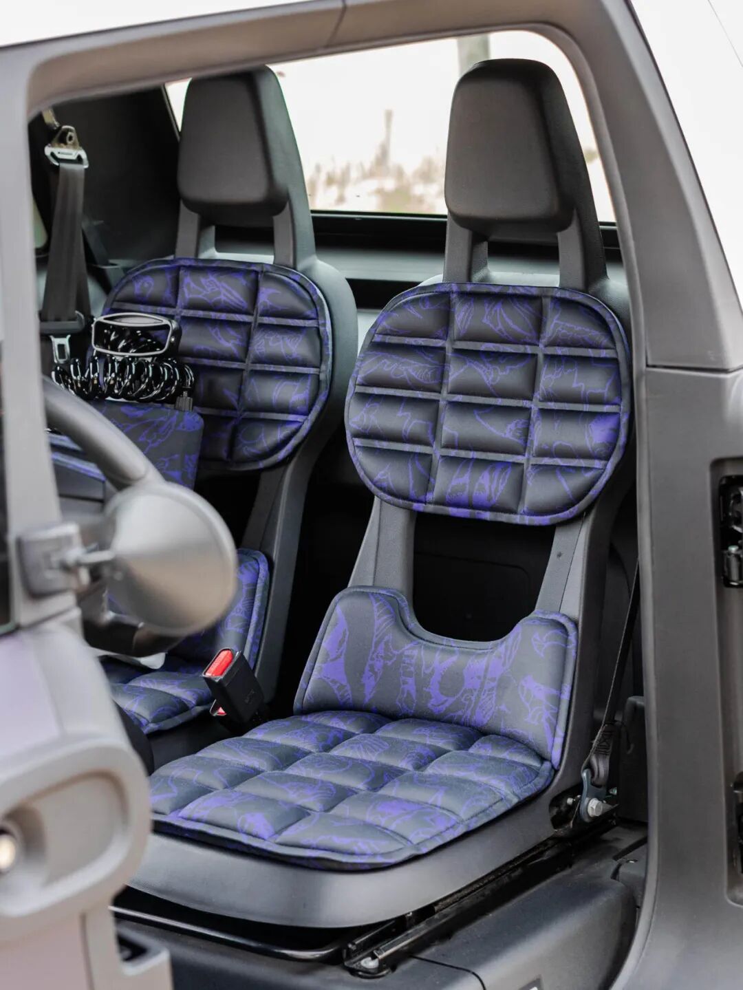 这一部分雪铁龙很务实,不走装饰路线,而是从冲浪者的日常痛点切入。主题色和外观保持一致,把紫色铺在座椅印花和仪表台储物盒上。纹样来自Rip Curl 本家的视觉体系,风格统一得很自然。