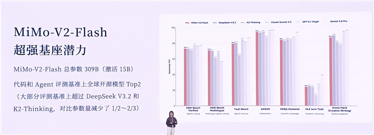 罗福莉进一步表示,小米MiMo-V2-Flash蕴含着超强基座潜力。尽管其总参数仅为309B(激活15B),但在代码和Agent评测基准上,它已跻身全球开源模型Top2行列,在大部分评测基准上甚至超越了DeepSeek V3.2和K2-Thinking,而参数量却减少了1/2至2/3,真正实现了以小博大。