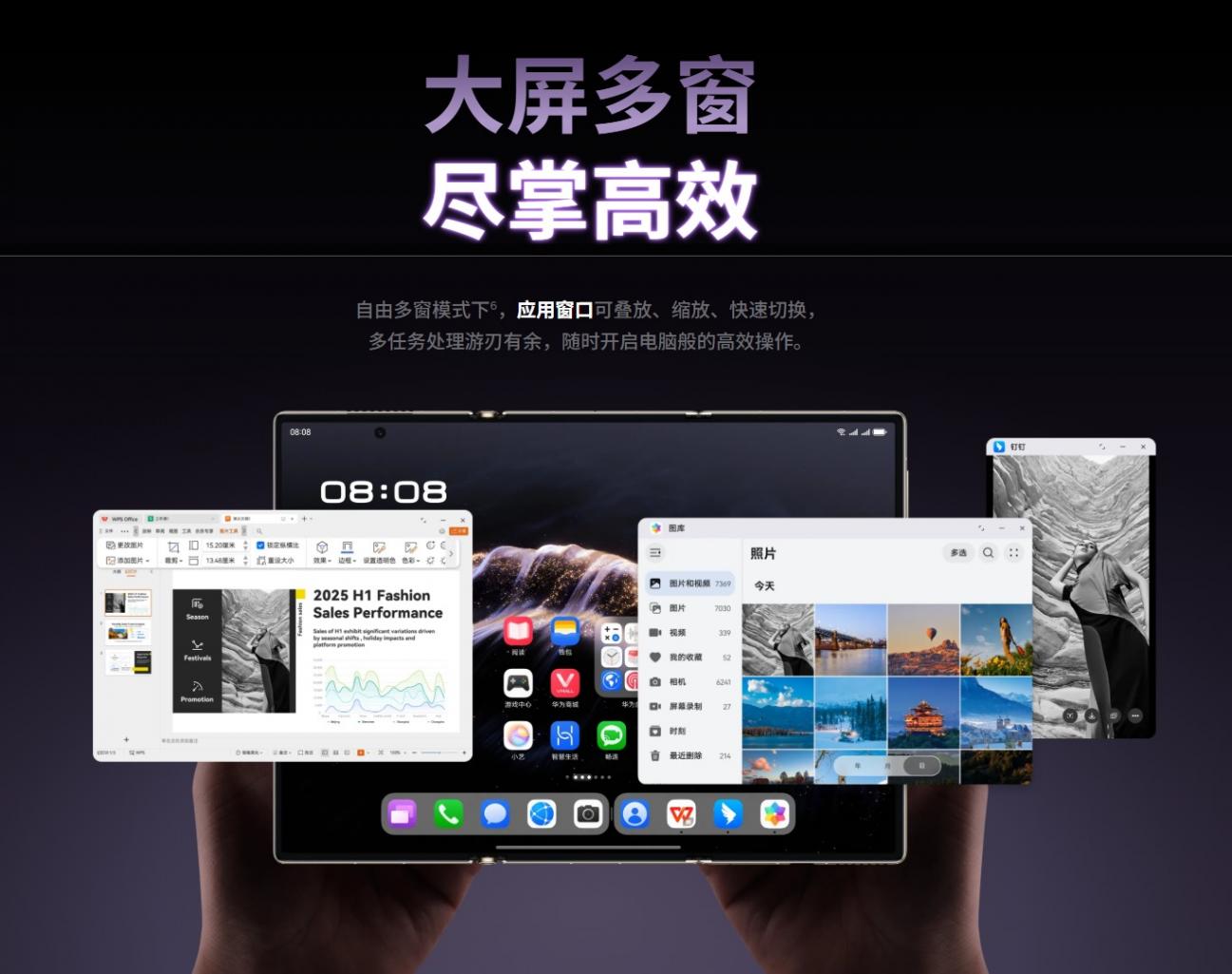 鸿蒙5.1系统的深度适配成为核心竞争力,三窗并行、跨屏拖拽功能与PC级WPS、CAD等专业应用原生兼容,搭配M-Pen 3手写笔实现高效移动办公,用户实测多任务处理效率提升显著。凭借先发优势与生态整合能力,华为三折叠系列全球市场份额已达48%,首款机型销量突破40万部,成为高端商务人群的首选生产力工具。其“一机三态”的场景适配理念,精准击中移动办公、跨设备协同等核心需求,虽屏幕外露存在潜在防护压力,但整体体验仍树立了行业标杆。