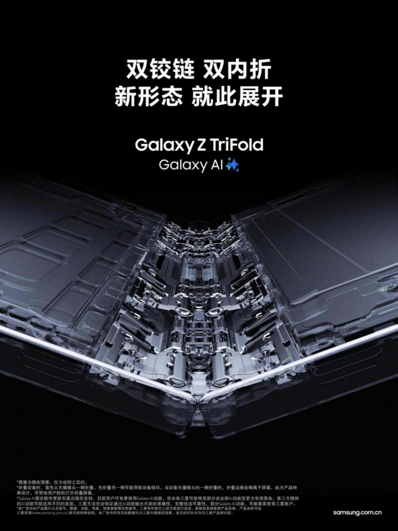 三星GalaxyZ TriFold采用“G形全内折”设计,以差异化路径切入三折叠赛道,外屏为6.5英寸动态AMOLED(2600尼特峰值亮度),内屏展开达10英寸(120Hz刷新率),折叠厚度14mm,重量309g,主打主屏包裹式防护。硬件配置上,高通特供版骁龙8至尊版保障性能输出,5600mAh大容量电池搭配45W有线+15W无线快充,2亿像素HP5主摄+1200万超广角+1000万长焦的影像系统支持100倍混合变焦。
