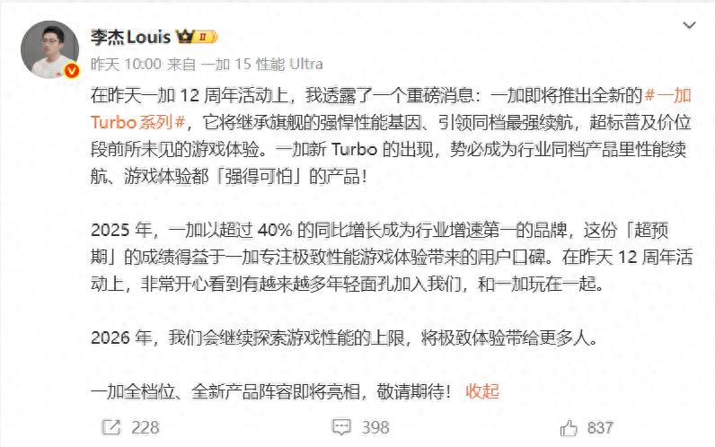 近日,一加中国区总裁李杰在一加 12 周年活动上正式官宣,一加将会推出全新一加 Turbo 系列新机。