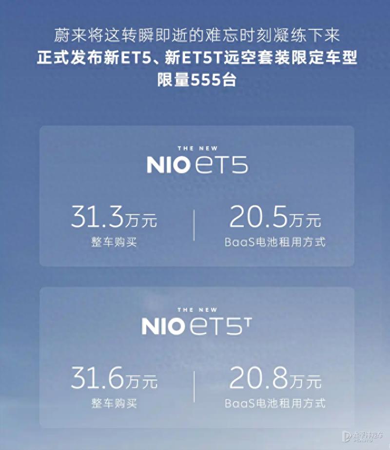 12月16日,蔚来新ET5/ET5T远空套装限定车型开启预订。蔚来新ET5远空套装限定车型整车售价 31.3万元,采用 BaaS 电池租用方式购买,售价20.5万元;蔚来新ET5T远空套装限定车型整车售价31.6万元,采用 BaaS 电池租用方式购买,售价20.8万元。两款新车共计限量 555 台,即日起至2026 年1月31日限时销售。