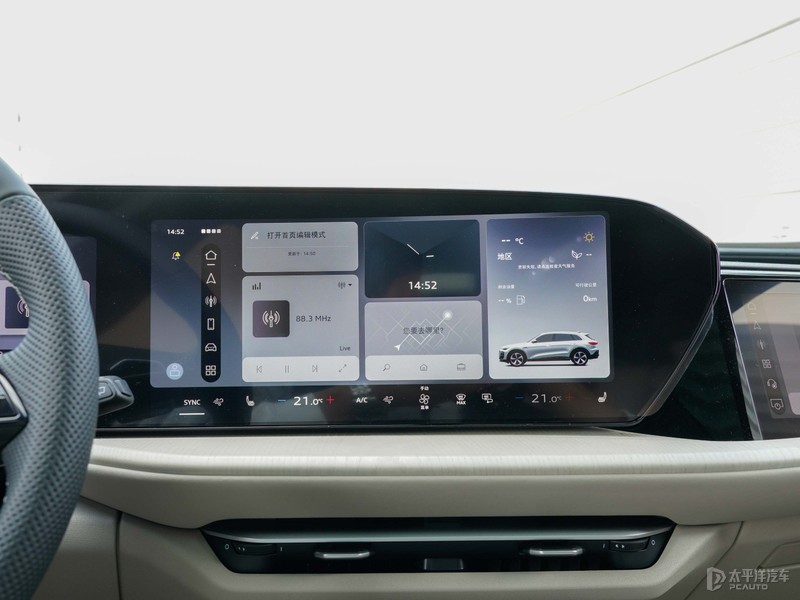 车辆双联屏是由11.9英寸的仪表+14.5英寸中控屏组成。其中全液晶仪表盘除了显示基础的行驶信息以外,还支持全屏导航地图。另外部分车型还拥有13.1英寸HUD。