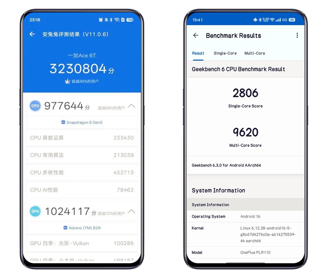 一加Ace 6T最大性能基石,是其全球首发的高通第五代骁龙8移动平台(骁龙8 Gen5)。这颗芯片在制程工艺和核心架构上与顶级的第五代骁龙8至尊版一脉相承,采用台积电第三代3nm工艺的Oryon架构。让这款手机在轻薄机身里也能发挥出极致的性能释放,游戏不止满帧,更能持久满帧,综合性能优秀,是一款非常适合游戏场景的处理器。