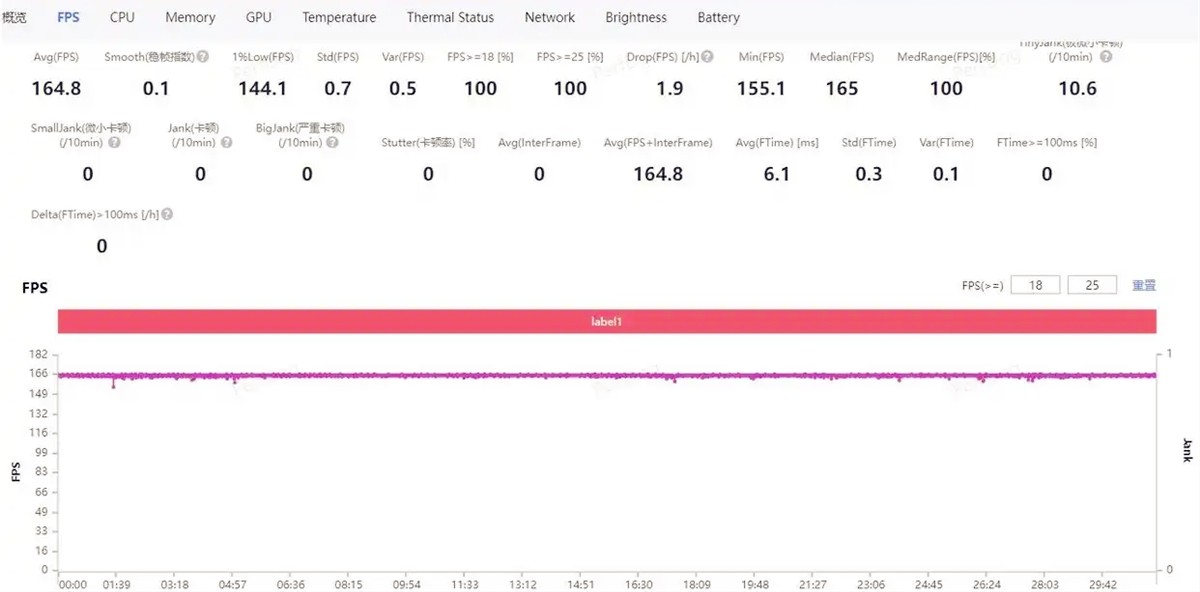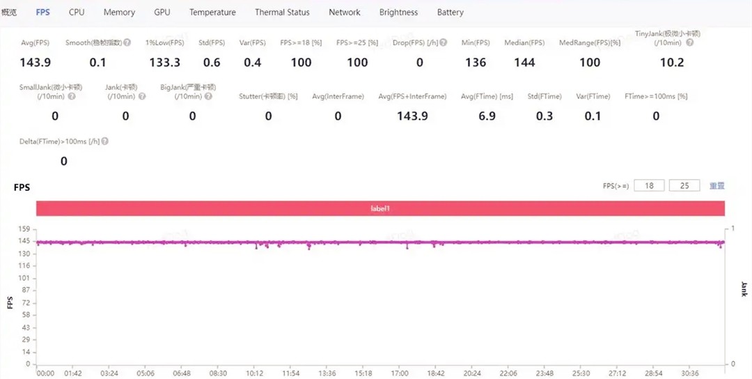 《王者荣耀》极限测试: 帧率近乎直线,1% Low帧133.3,温控出色。