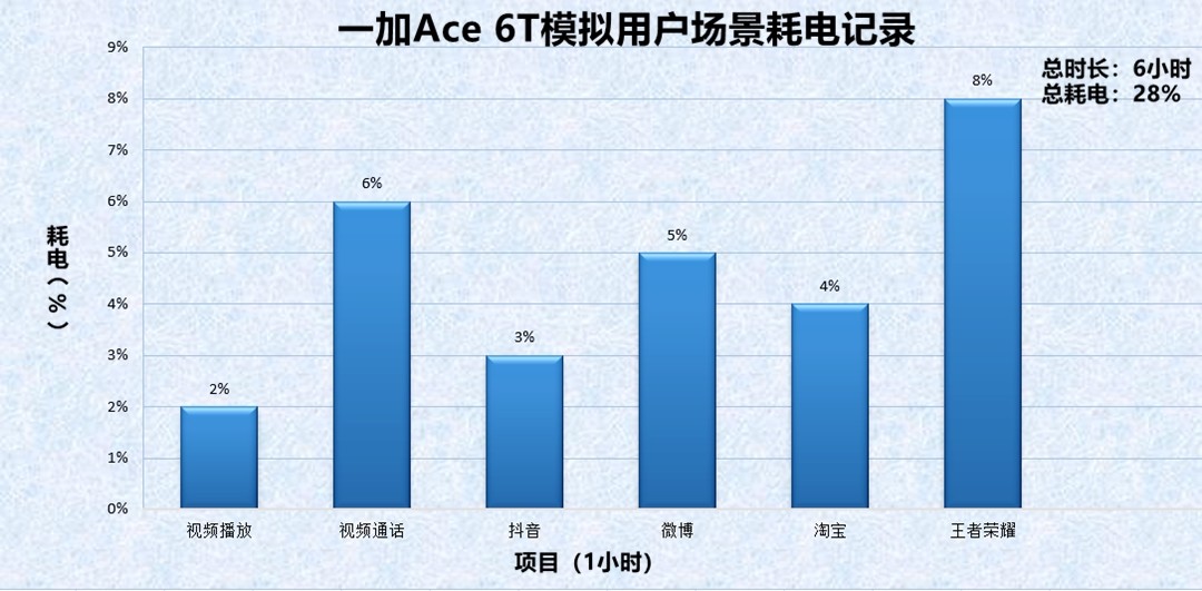 为了真实的模拟日常用户的使用场景、按照用户平常使用最多的场景做了一些功耗测试。全程六小时重度续航测试、较为准确的模拟了重度手机用户每天的使用场景。六小时重度使用后最终剩余电量为72%。整体续航水平当属优秀,重度用户使用两天一冲毫无压力, 12小时待机耗电量约1%左右。(WiFi联网后台应用刷新)