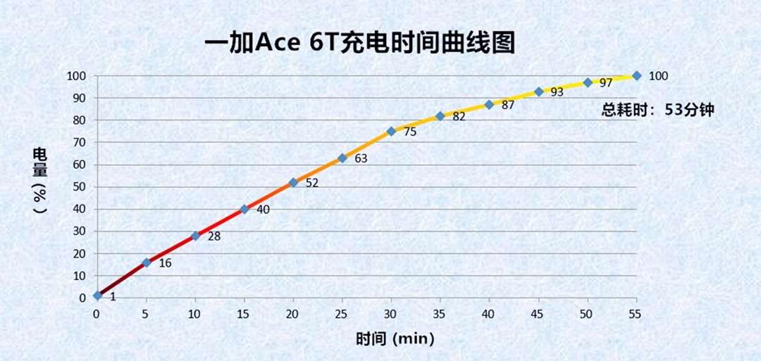 实际测试从1%的电量冲到100%总耗时53分钟。前30分钟充电效率上升得非常快,10分钟即可充至28%,30分钟即可充至75%。一加Ace 6T的充电“回血”能力妥妥的第一梯队水准。这样的充电速度,让用户无需长时间等待,随时都能拥有充足电量应对各种场景。无论是紧急出门前的快速充电,还是日常的充电使用,一加Ace 6T的快充表现都能让人十分满意。
